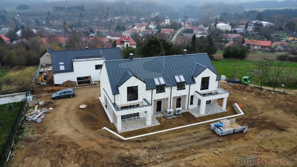 Exkluzivně nabízíme novostavbu dvojdomu 5+kk, 106m2 + garáž a tech. místnost 24m2, terasa, zahrada 1035m2, Postupice, okr. Benešov. Představujeme Vám novostavbu hezkého a moderního dvojdomu, kde každá jednotka je s dispozicí 5+kk, užitnou plochou 106m2 s garáží a terasou a to vše na pozemku 1123m2. Dům se nachází v obci Postupice, jen 40min. od Prahy, nebo 10km od okresního města Benešov a je již téměř dokončen. K prodeji jsou obě poloviny nebo dům jako celek, první zájemce má výhodu volby strany která mu více vyhovuje.