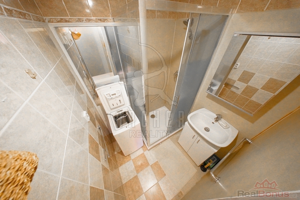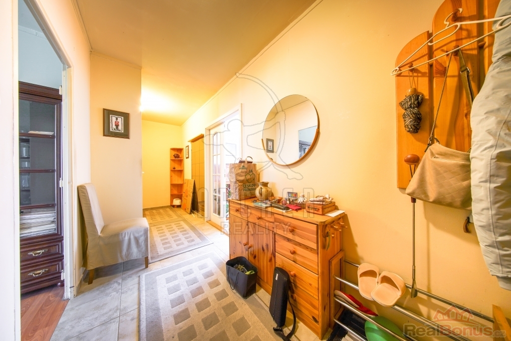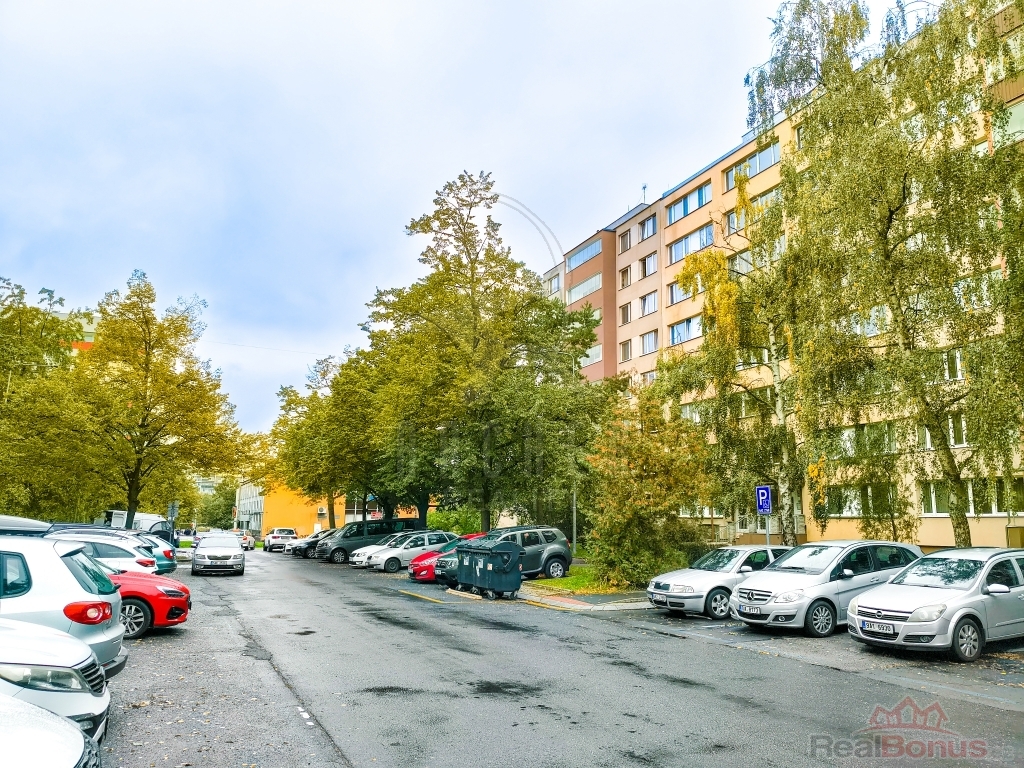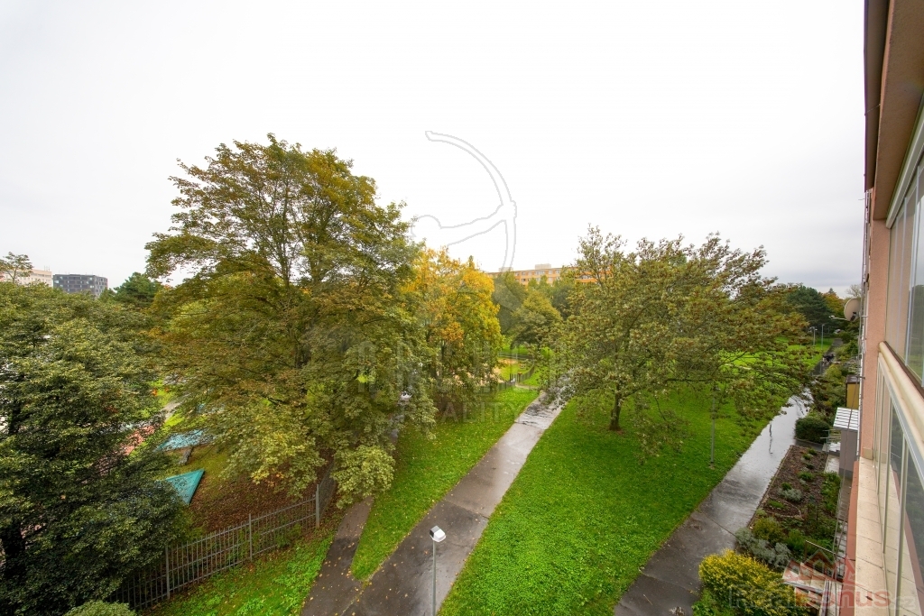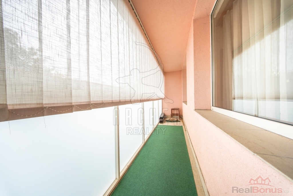 Ložnice, aktuálně spojené v jeden pokoj, směřují na severozápad do klidné ulice plné stromů, obývací pokoj a kuchyně pak směřují na jihovýchod a z obývacího pokoje je přístupná prostorná, 5,8m2 zasklená a vertikálními žaluziemi zastíněná lodžie. Stejně tak okna jsou vyměněna za kvalitní plastová.