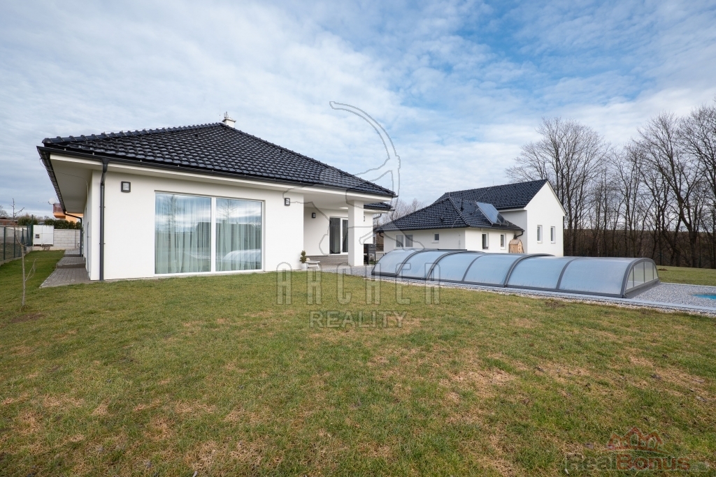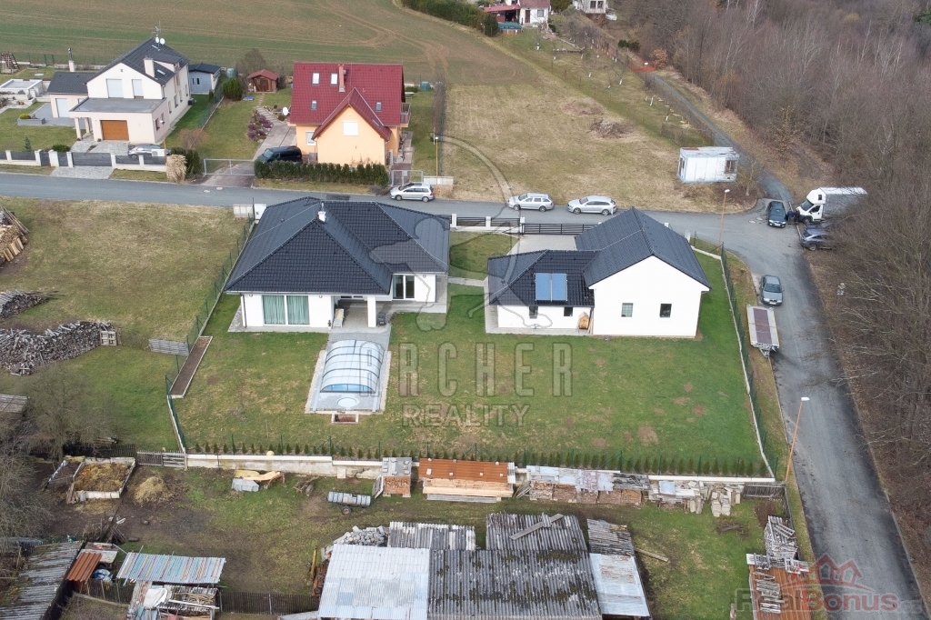 Součástí udržované zahrady je zastřešený bazén ( 6 x 3 x 1,5m), 4 parkovací místa na pozemku před vjezdem do garáží.