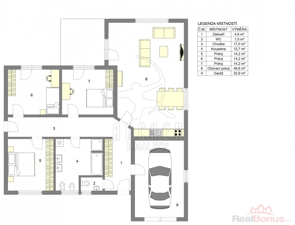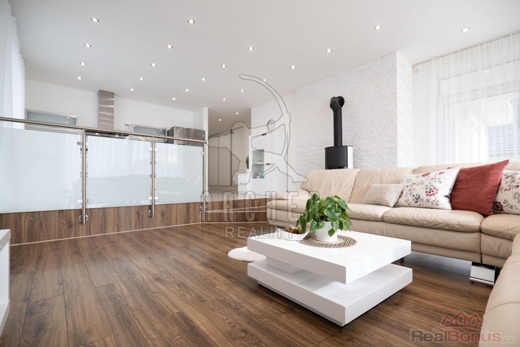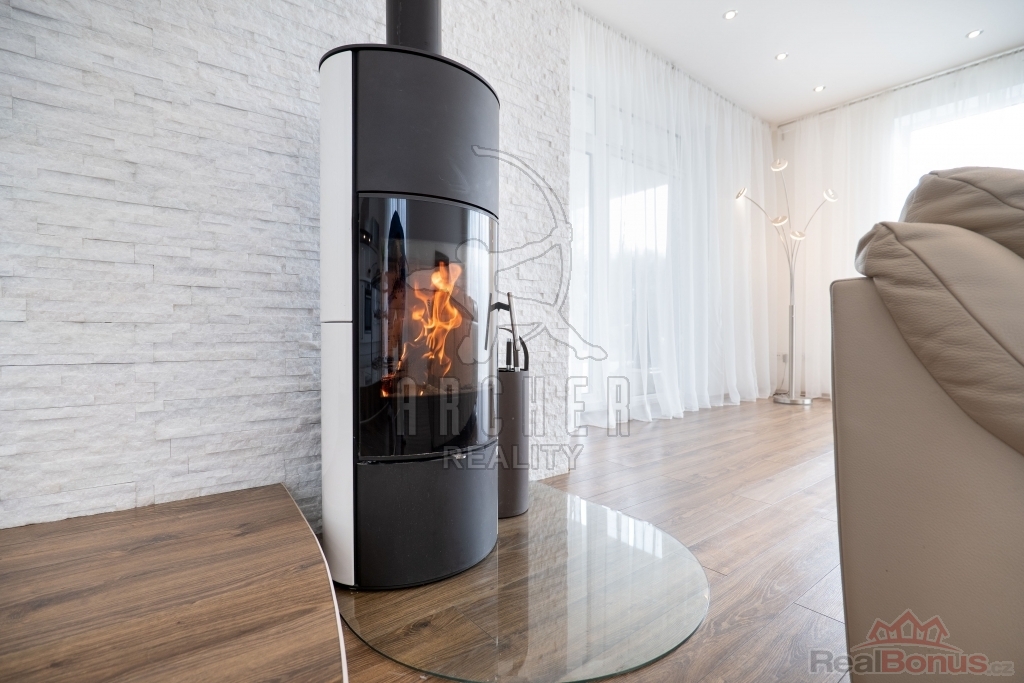 myčka, lednice s mrazákem), s přímým vstupem na krytou zahradní terasu s posezením. Součástí obývacího pokoje je krb na dřevo, dotvářející příjemnou atmosféru domova. 2 dětské pokoje jsou s přímými vstupy na terasu, oddělená ložnice. Nedílnou součástí je prostorná