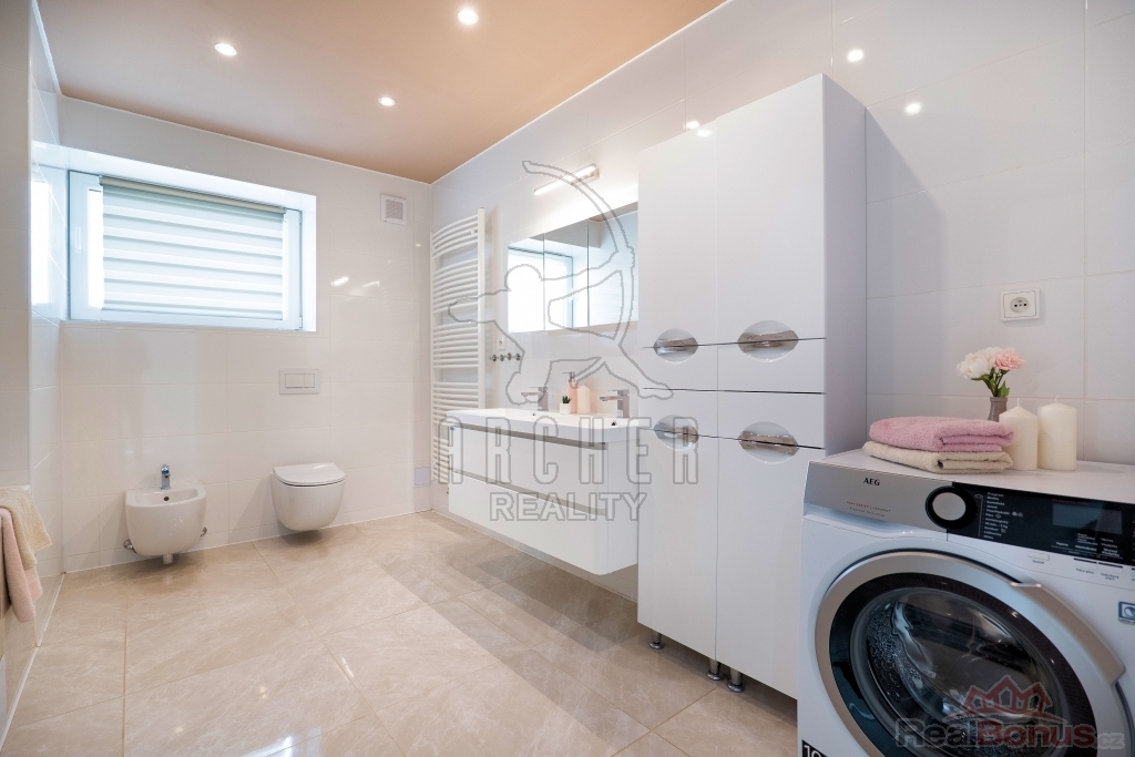 koupelna s vanou, sprchovým koutem, toaletou, bidetem, umyvadlem a tepelným žebříkem. Zvláště je pak umístěna spižírna a samostatná toaleta (pro hosty). Podlahová krytina tvořena laminátovou plovoucí podlahou a dlažbou. Nadstandardní interiérové dveře (s magnetickým