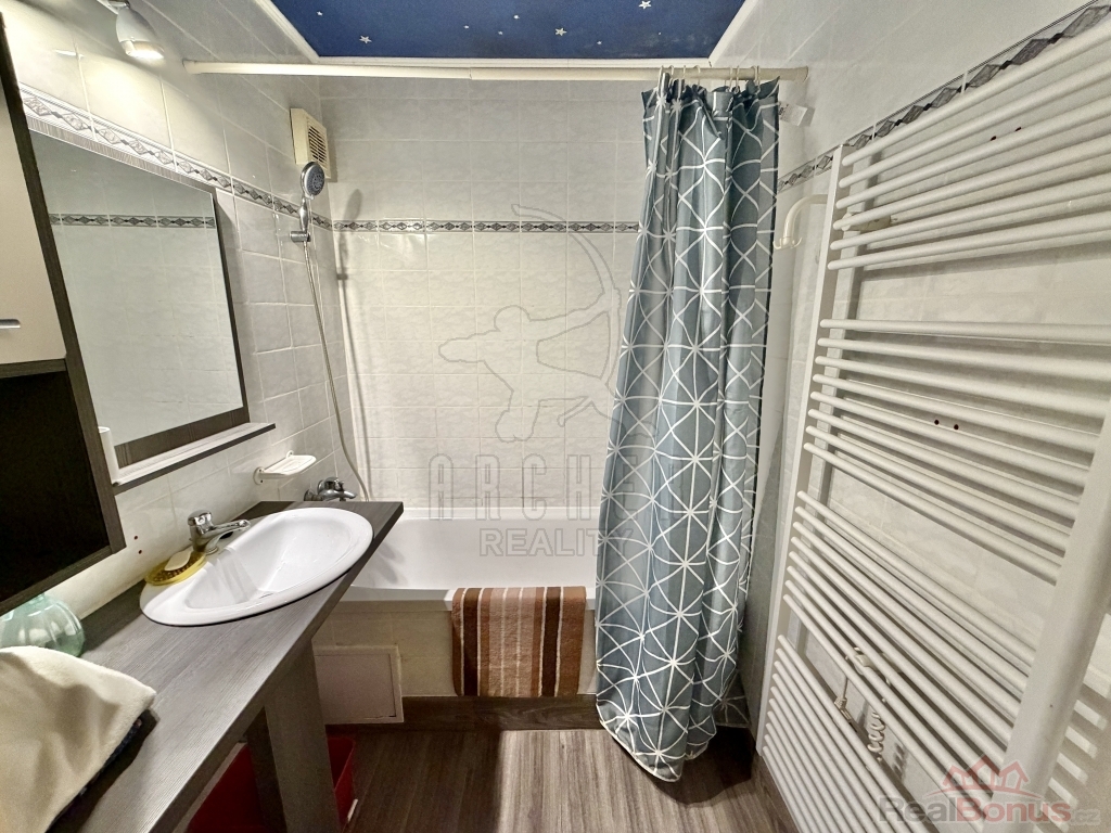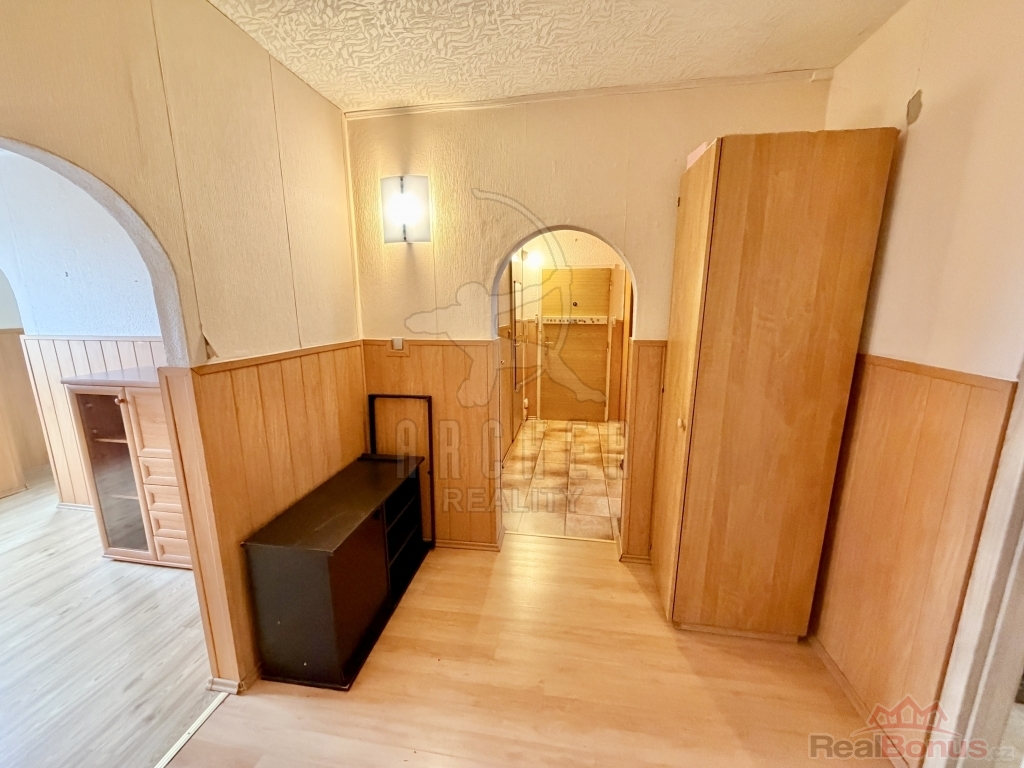 Dispozice je velmi praktická samostatné WC, koupelna s vanou a elektrickým žebříkem, kuchyň se starší linkou navazující na prostornou jídelnu. Vytápění je řešeno elektrickými stropními infrapanely s regulací v každé místnosti zvlášť.