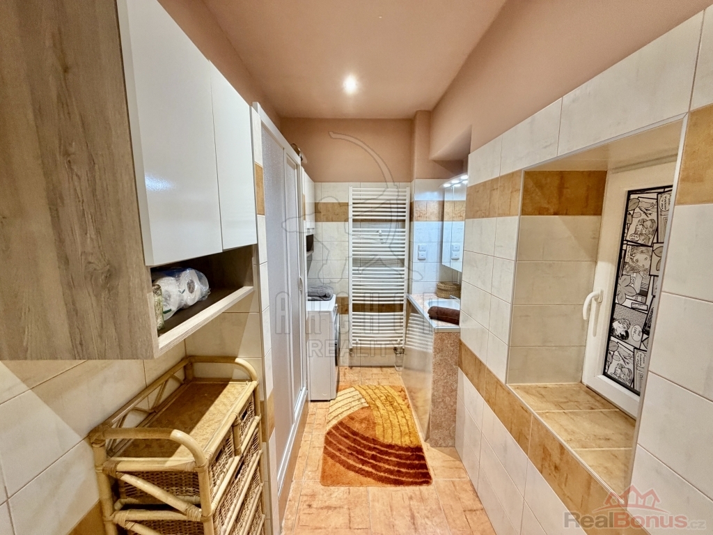 Byt nabízí velmi chytré a funkční řešení prostoru. K dispozici je dostatek úložných prostor přímo v bytě najdete špajzku i samostatnou šatnu. Velkým benefitem je také prostorná koupelna se sprchovým koutem, která působí vzdušně a komfortně.