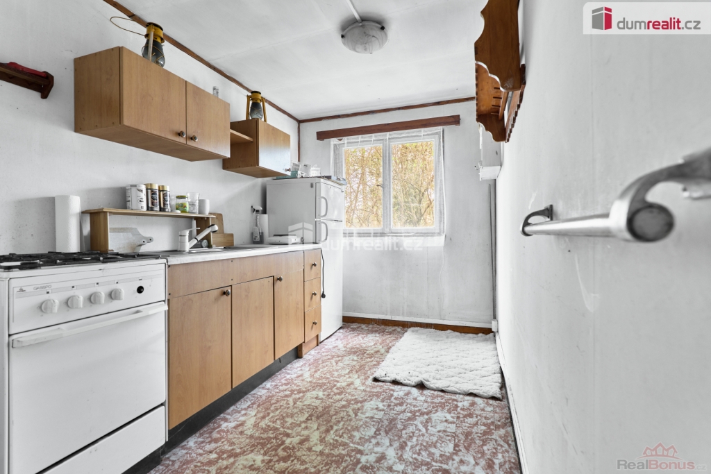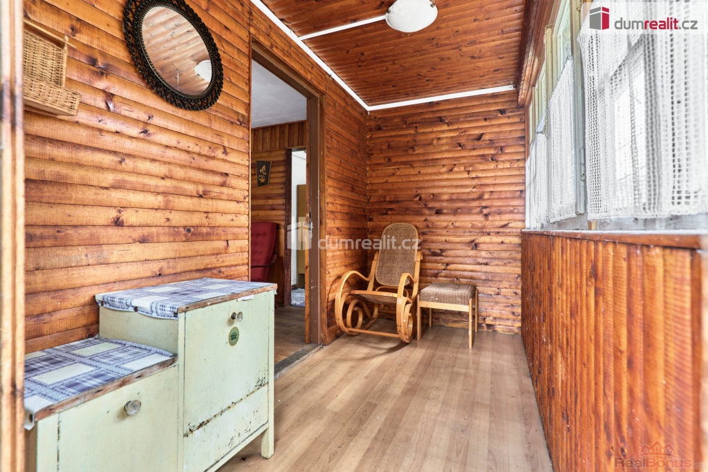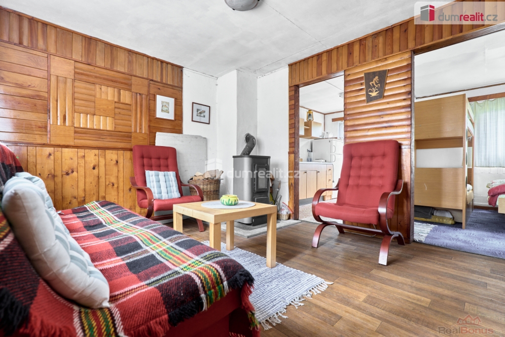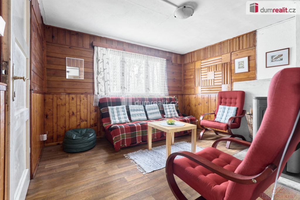 vč. právního servisu a provize RK, Dumrealit.cz Vám zprostředkuje Nabízíme exkluzivně k prodeji dřevěnou chatu v oblíbené rekreační oblasti u Velkého Rybníku nedaleko Karlových Varů. Poloha přímo v lese, těsně nad hrází, zaručuje klid, soukromí a ideální podmínky pro odpočinek i víkendové pobyty. Objekt je přízemní s předsíní, kuchyní, obývacím pokojem a ložnicí. Celková plocha pozemku je 488 m. Na něm je kromě samotné chaty ještě dřevěná kůlna na nářadí a dřevo. V místě jsou restaurace a menší prodejna, veškerá občanská vybavenost je dostupná v Hroznětíně (3 km), v Ostrově nebo Karlových Varech (obojí cca 9 km). Parkování je možné přímo na pozemku. Ev. číslo: 655395. Energetický štítek: G