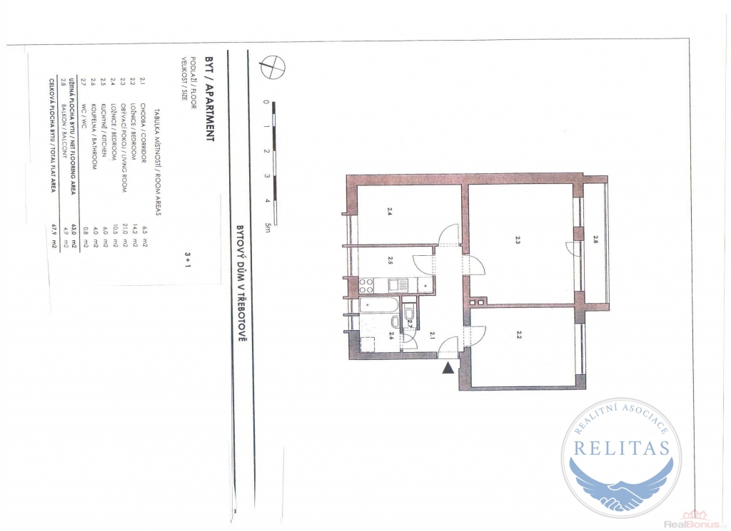 Byt má podlahovou plochou 63 m2, dále k němu patří v současné době zvětšený a zasklený balkon cca 8m2 a samostatný zděný sklep o velikosti 4m2.