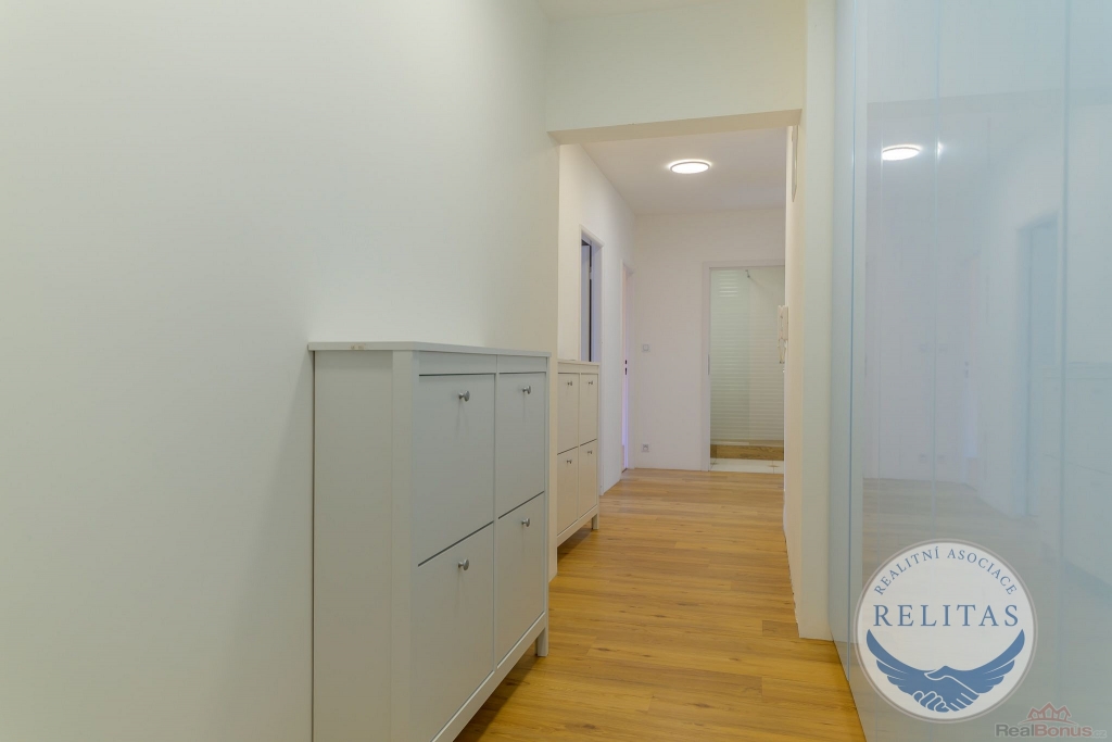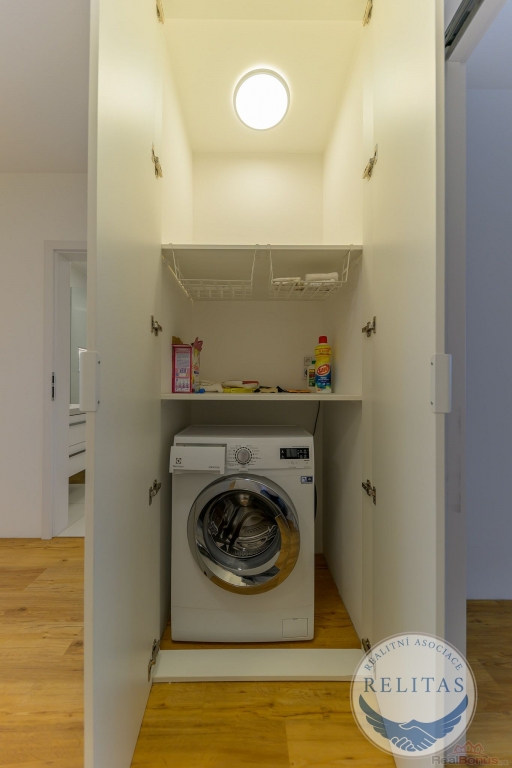 Dispozice bytu tvoří vstupní předsíň, prostorný obývací pokoj s moderní kuchyňskou linkou vybavenou indukční varnou deskou a přímým vstupem na lodžii, dvě samostatné neprůchozí ložnice (z nichž jedna disponuje šatní skříní), koupelna se sprchovým koutem a toaletou, dále praktická komora a vestavěná skříň s pračkou.
