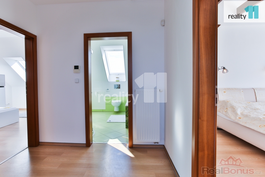 Dům má k dispozici prostornou garáž (28,5 m), do níž je zavedena voda i topení. Nad garáží se dále nachází další velká místnost (38,4 m). Po celém domě najdete dostatek úložných prostor.