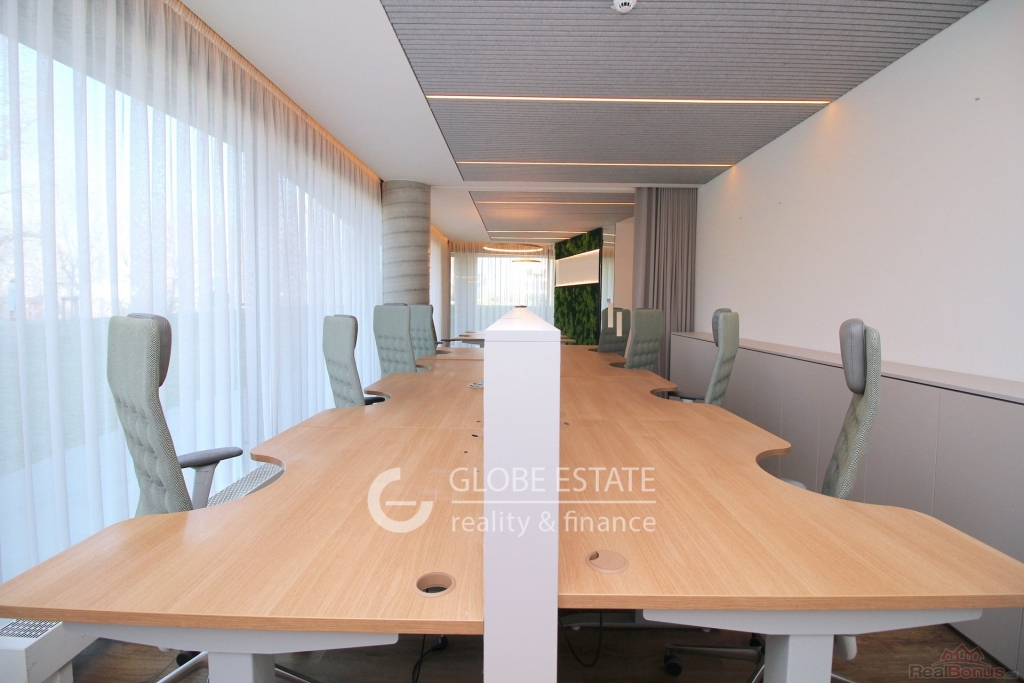 Tato jedinečná jednotka, umístěná v 1. nadzemním podlaží, nabízí velkorysou plochu 86,21 m2, dispozičně řešenou jako moderní 2+kk, to poskytuje maximální flexibilitu pro různé podnikatelské záměry. Kanceláře doplňuje privátní terasa o rozloze 42,67 m2, která představuje ideální místo pro relaxaci, neformální schůzky nebo inspirativní venkovní pracovní prostor.