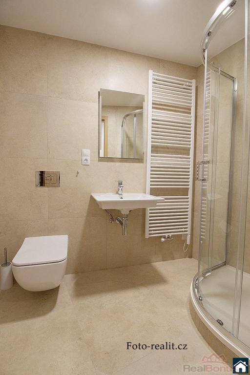 Byt má luxusní vybavení - kuchyňská linka s indukční varnou deskou, myčkou, lednicí a pračkou. Zařizovací předměty jsou Villeroy Boch.