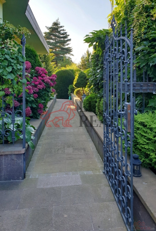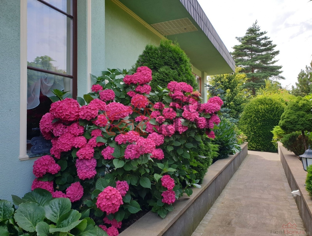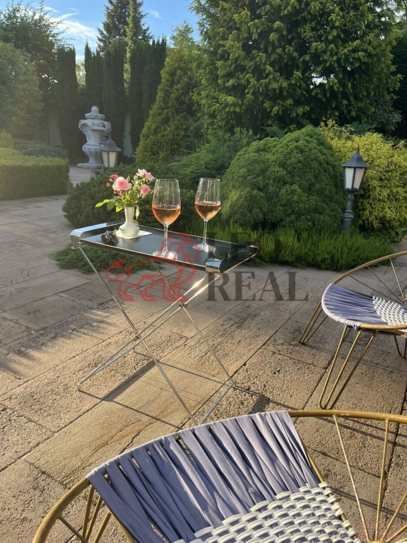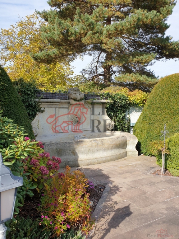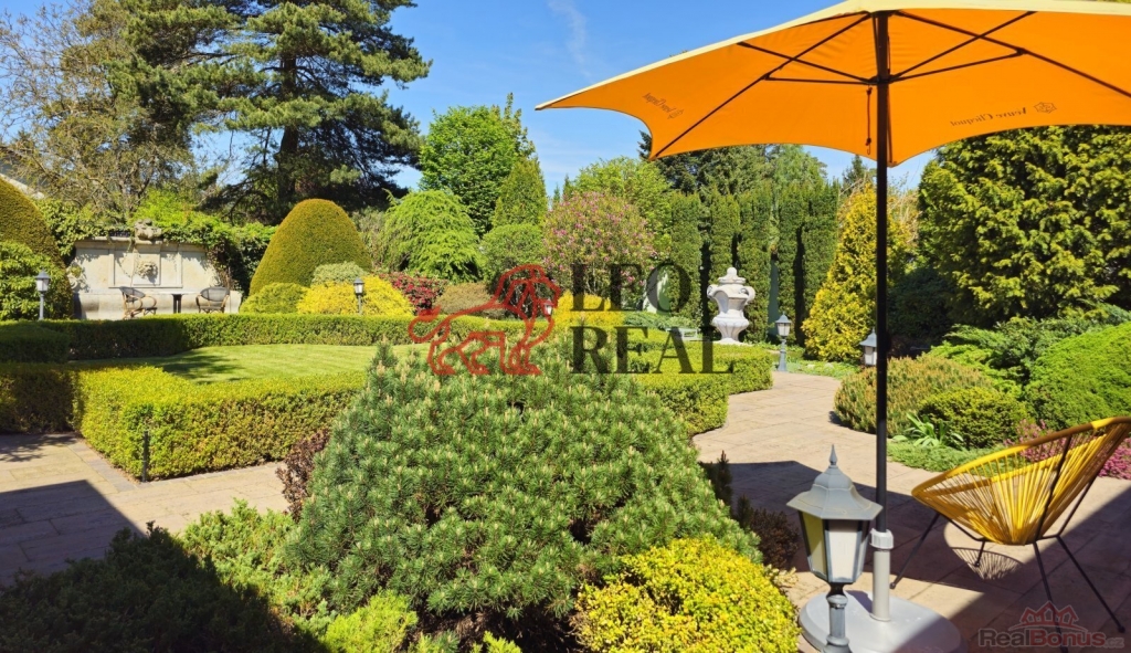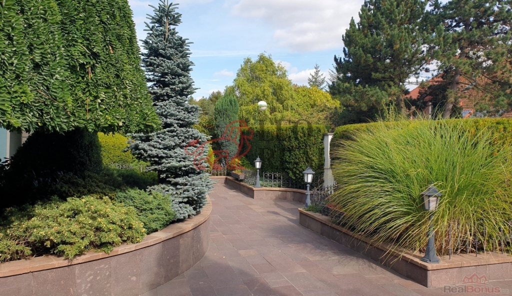 Zahrada je navržena ve stylu francouzské zahradní architektury s množstvím vzrostlých stromů a okrasných dřevin. Atmosféru dotvářejí pískovcové chodníčky, originální skulptury a stylové lampy pro noční osvětlení. Pískovcová kašna a altán dotvářejí ráz této zahrady, plné romantických zákoutí a ptačího zpěvu. O zavlažování se stará automatický závlahový systém napojený na vlastní 17 metrů hlubokou studnu s dostatkem vody, na kterou lze v případě potřeby alternativně připojit i celý dům.