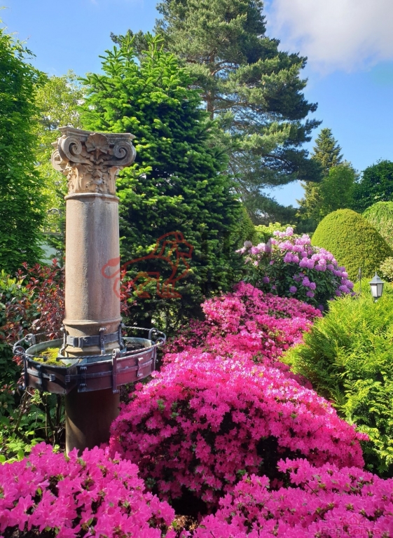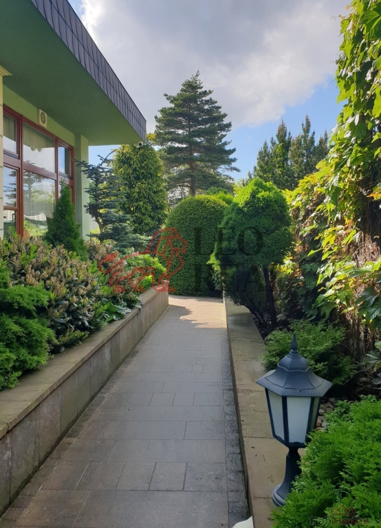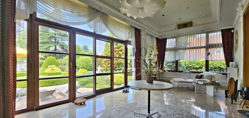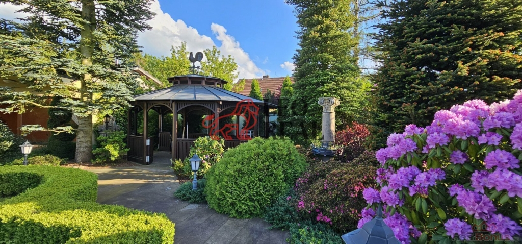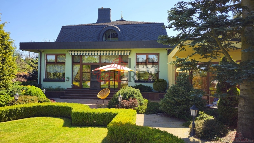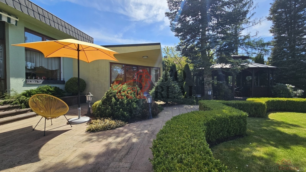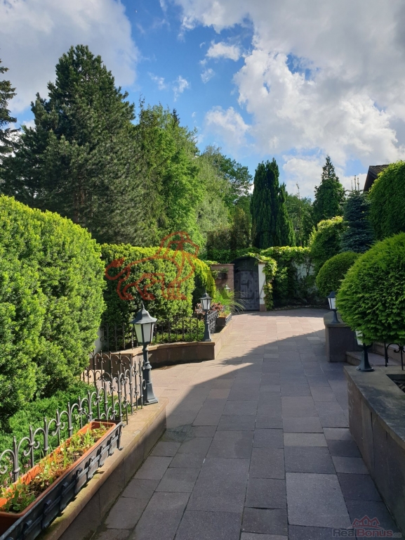 Zahrada je navržena ve stylu francouzské zahradní architektury s množstvím vzrostlých stromů a okrasných dřevin. Atmosféru dotvářejí pískovcové chodníčky, originální skulptury a stylové lampy pro noční osvětlení. Pískovcová kašna a altán dotvářejí ráz této zahrady, plné romantických zákoutí a ptačího zpěvu. O zavlažování se stará automatický závlahový systém napojený na vlastní 17 metrů hlubokou studnu s dostatkem vody, na kterou lze v případě potřeby alternativně připojit i celý dům.