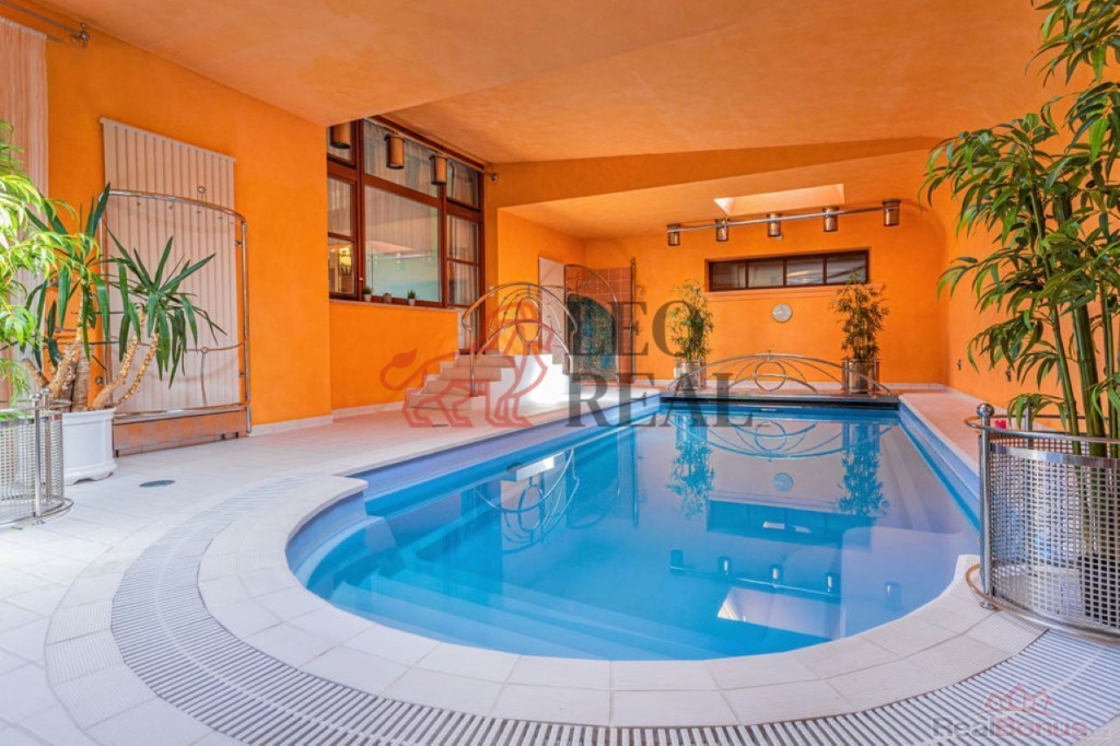 Vnitřní bazén o ploše 72 m2 je přímo součástí domu a má i přístup jak z obytné části, tak ze zahrady. Je zde dále sprcha a odpočinková zóna. Má plně automatizovaný provoz, je vytápěný a lze jej využívat celoročně.