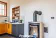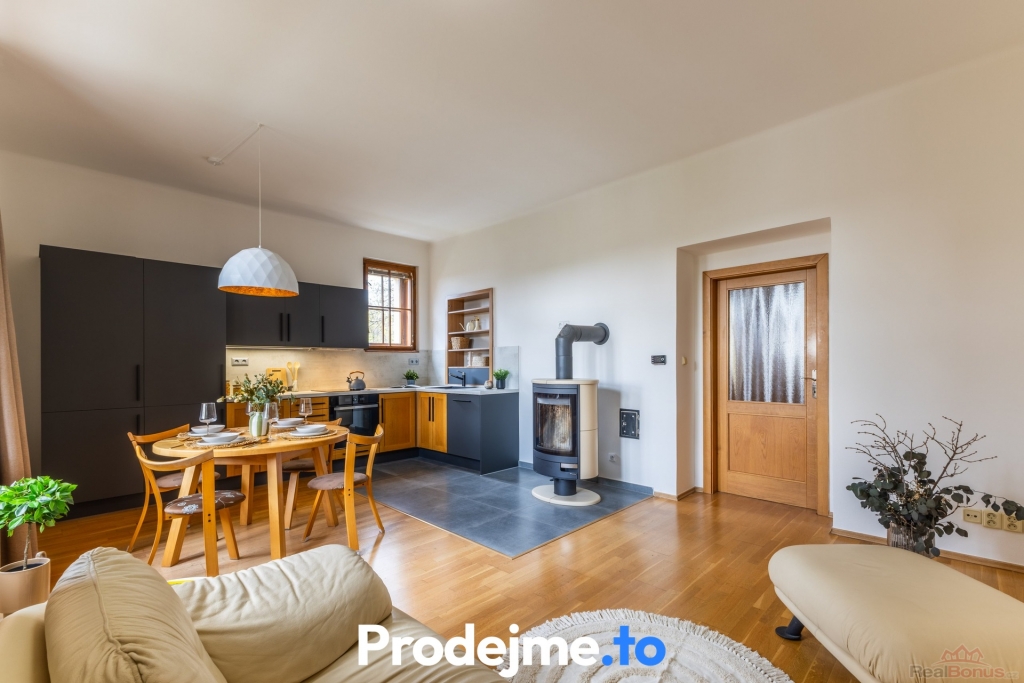 Jižně orientovanému obývacímu pokoji dominuje elegantní tmavá kuchyňská linka s dřevěnými akcenty a plným vybavením ? lednice s mrazákem, myčka, trouba, indukční deska, digestoř. Prostor je díky oknům krásně prosvětlený, a když se ochladí, atmosféru i teplotu zvednou moderní krbová kamna.