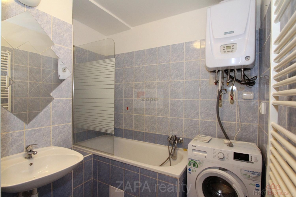 - byt ve 4. podlaží cihlového domu bez výtahu je zařízen nábytkem a vybavením na fotografiích - lednice, pračka,