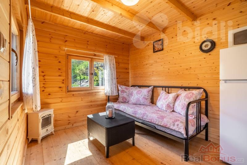 útulný interiér obložený dřevem - okamžitě navodí chatařskou pohodu