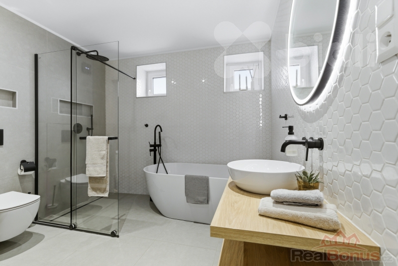 Koupelna je řešena moderně a komfortně, velkým benefitem je zde podlahové vytápění.